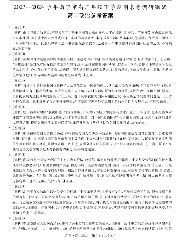 广西壮族自治区2023-2024学年南宁市高二年级下学期期末考试调研测试 政治答案