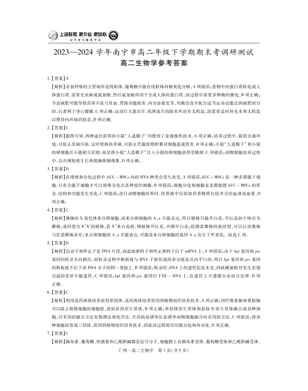 广西壮族自治区2023-2024学年南宁市高二年级下学期期末考试调研测试 生物答案