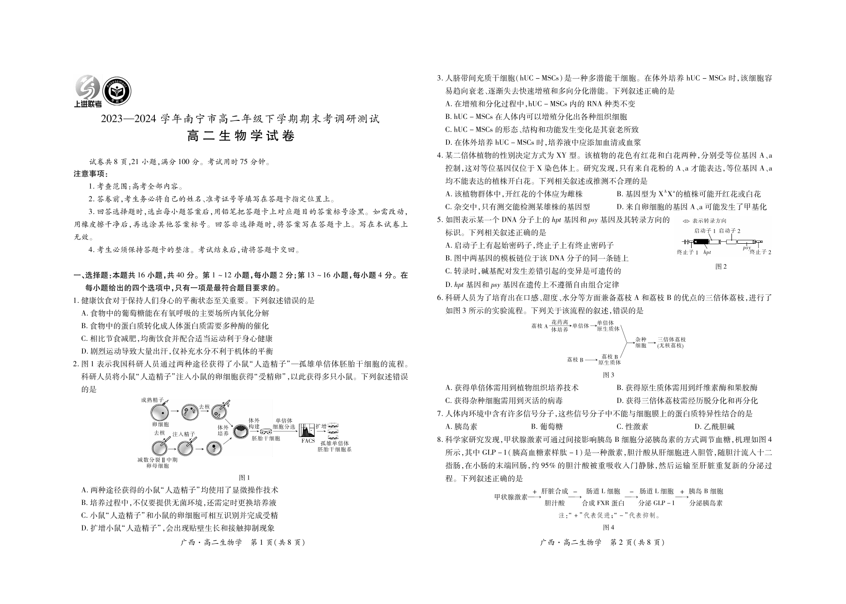 广西壮族自治区2023-2024学年南宁市高二年级下学期期末考试调研测试 生物