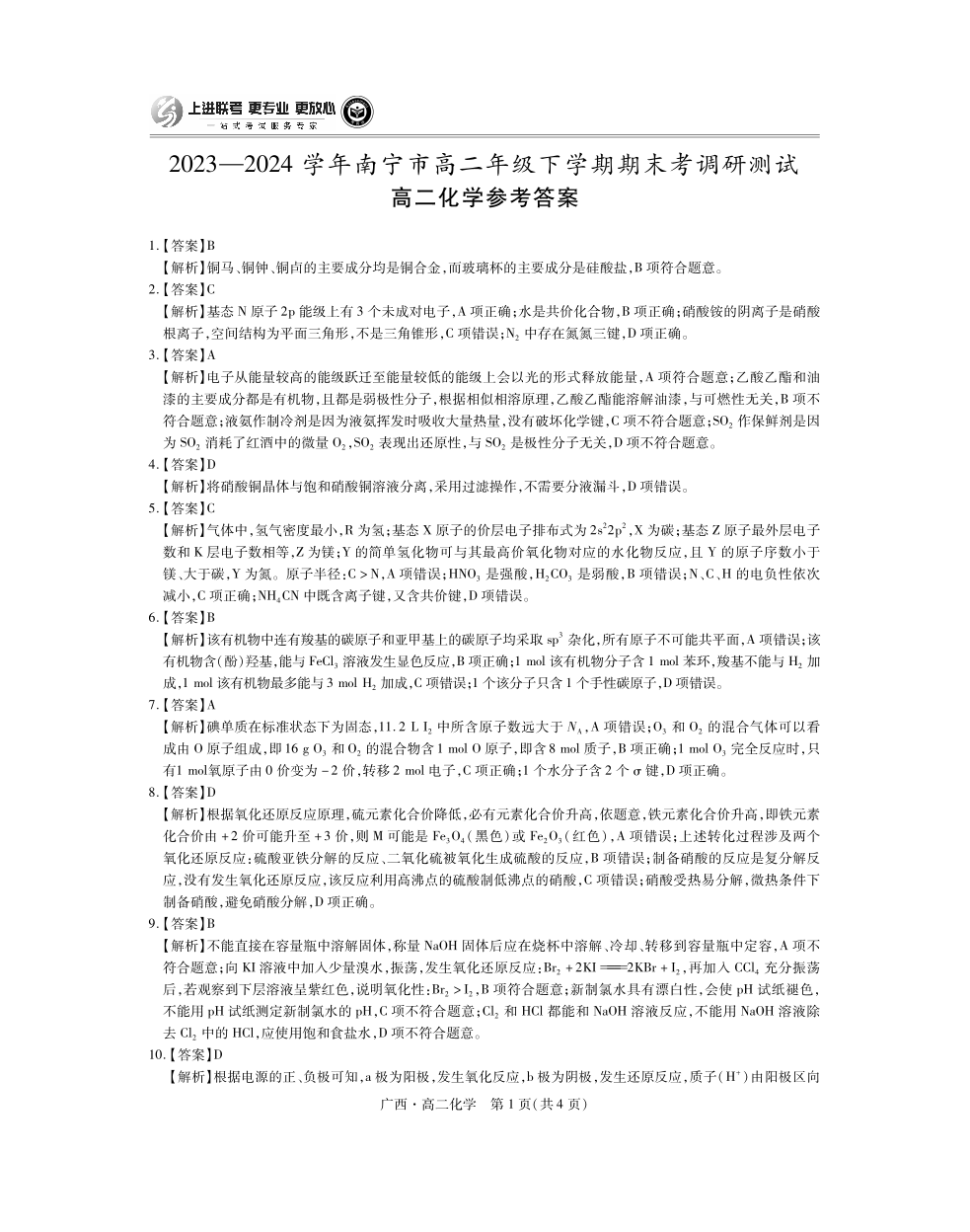 广西壮族自治区2023-2024学年南宁市高二年级下学期期末考试调研测试 化学答案