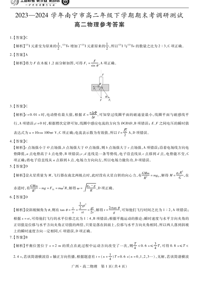 广西壮族自治区2023-2024学年南宁市高二年级下学期期末考试调研测试 物理答案
