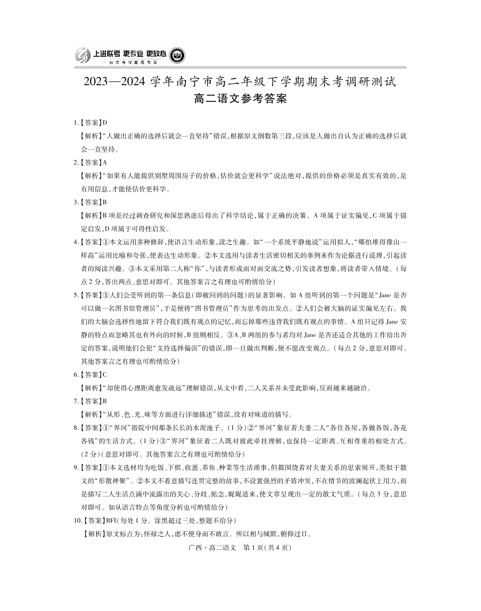 广西壮族自治区2023-2024学年南宁市高二年级下学期期末考试调研测试 语文答案