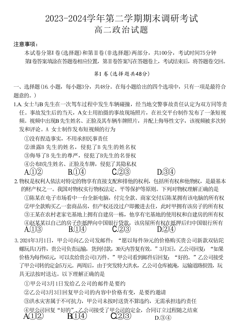 河南省开封市2023-2024学年第二学期高二期末调研考试 政治