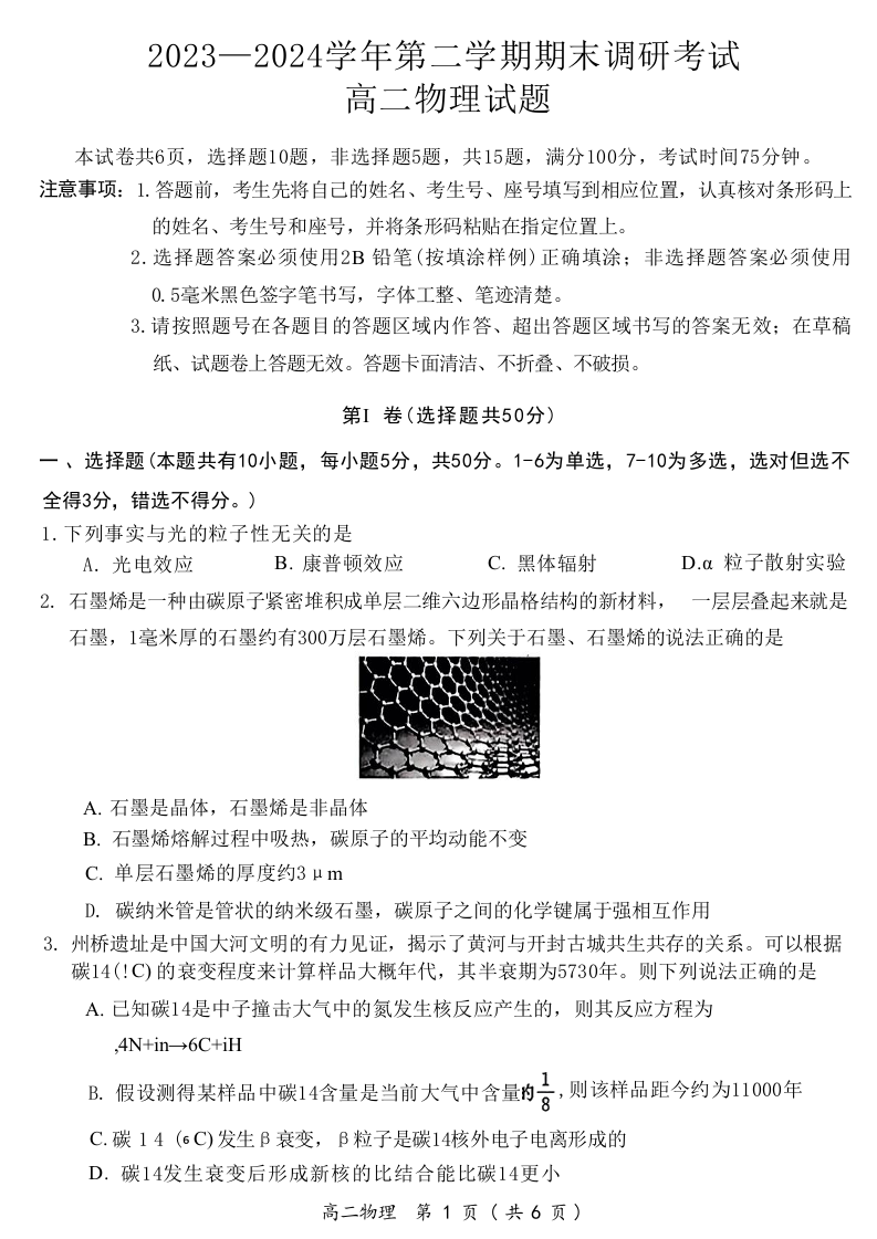 河南省开封市2023-2024学年第二学期高二期末调研考试 物理