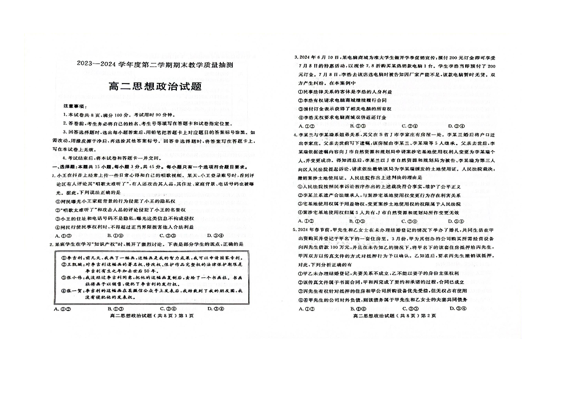山东省聊城市2023-2024学年高二下学期期末教学质量抽测考试 政治