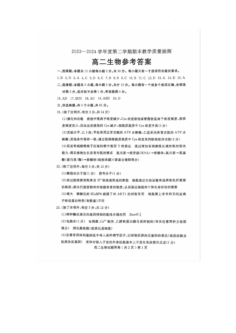 山东省聊城市2023-2024学年高二下学期期末教学质量抽测考试 生物答案