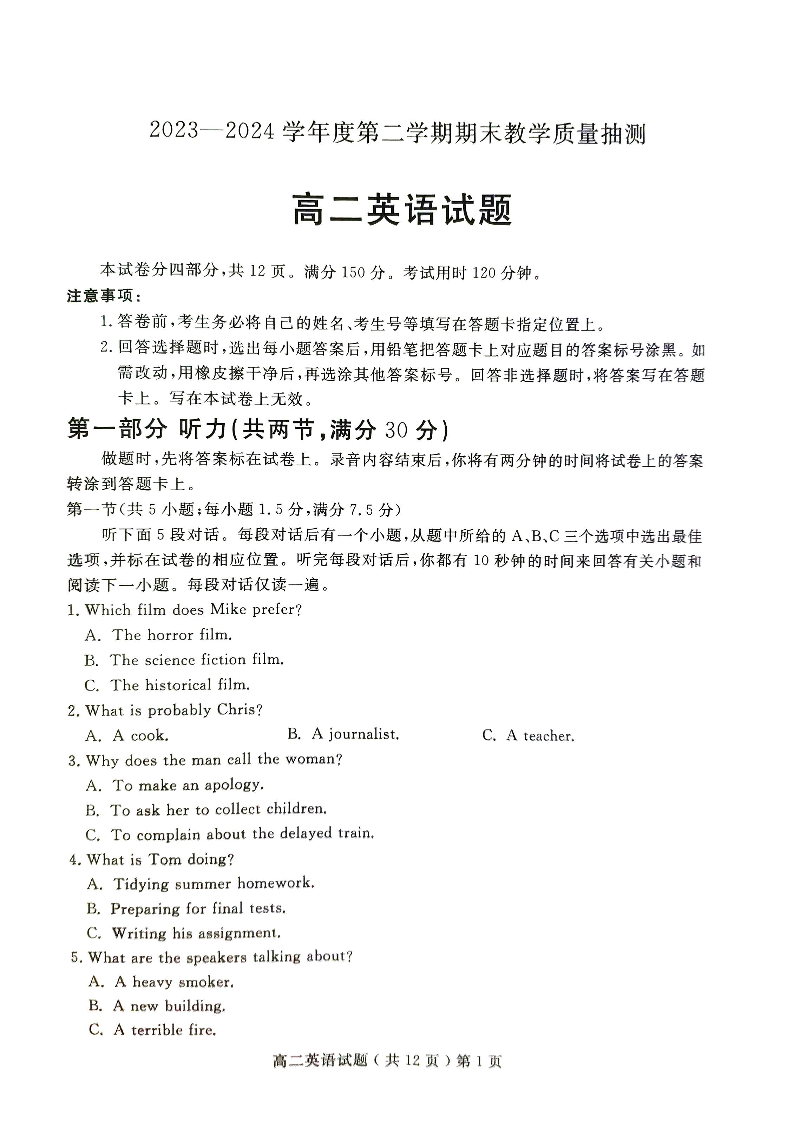 山东省聊城市2023-2024学年高二下学期期末教学质量抽测考试 英语