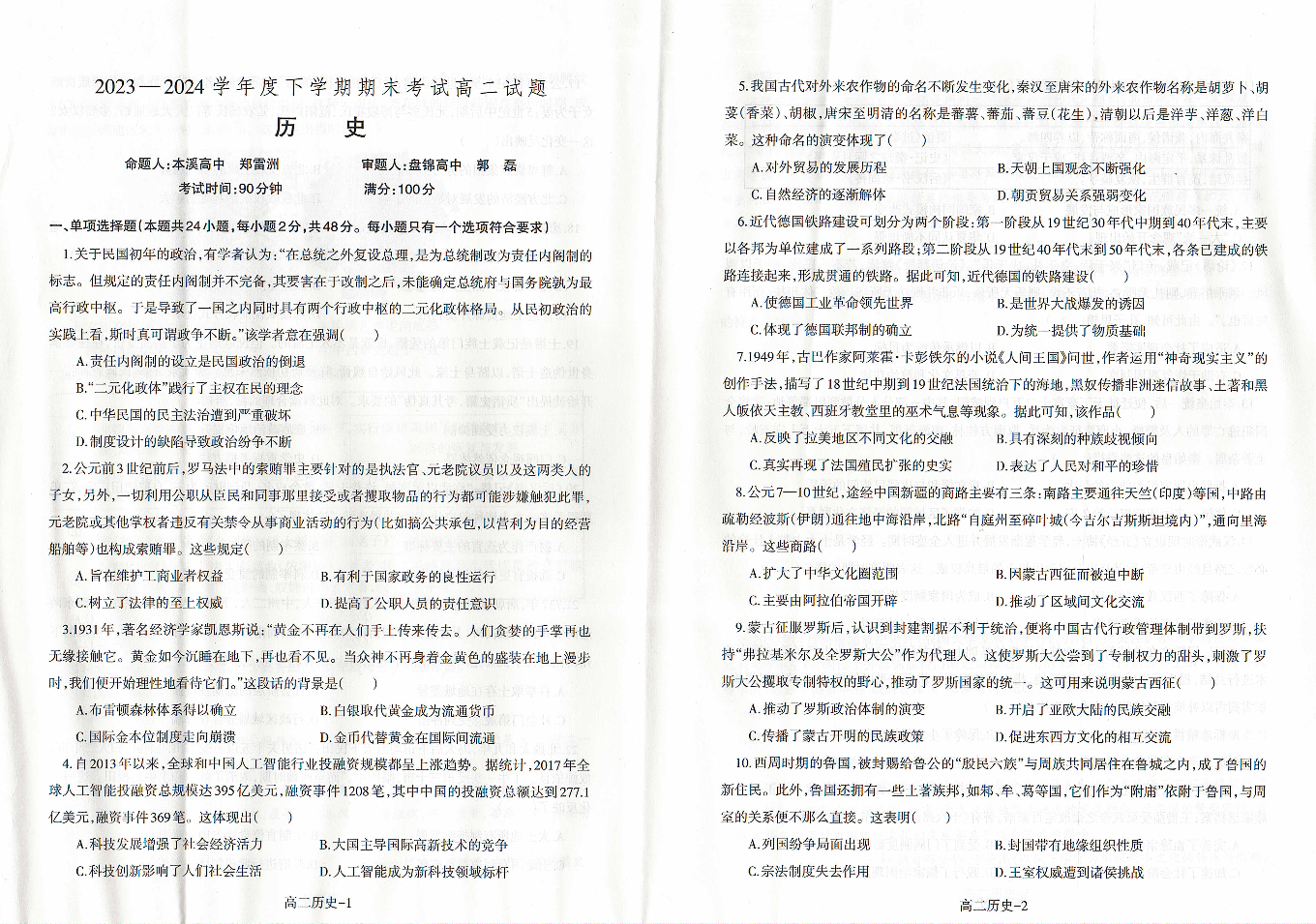 辽宁省协作体2023-2024学年高二下学期7月期末考试 历史