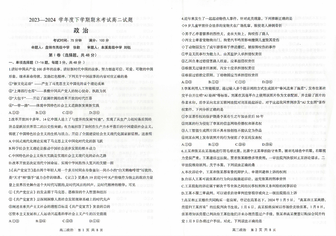 辽宁省协作体2023-2024学年高二下学期7月期末考试 政治