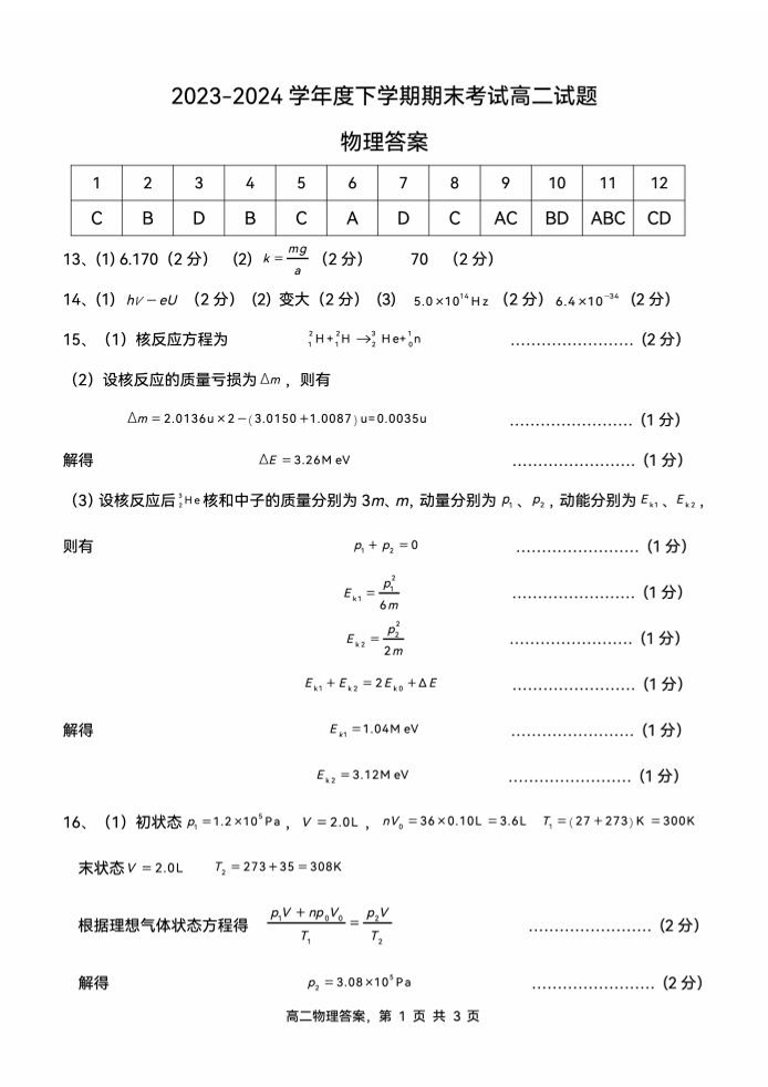 辽宁省协作体2023-2024学年高二下学期7月期末考试 物理答案