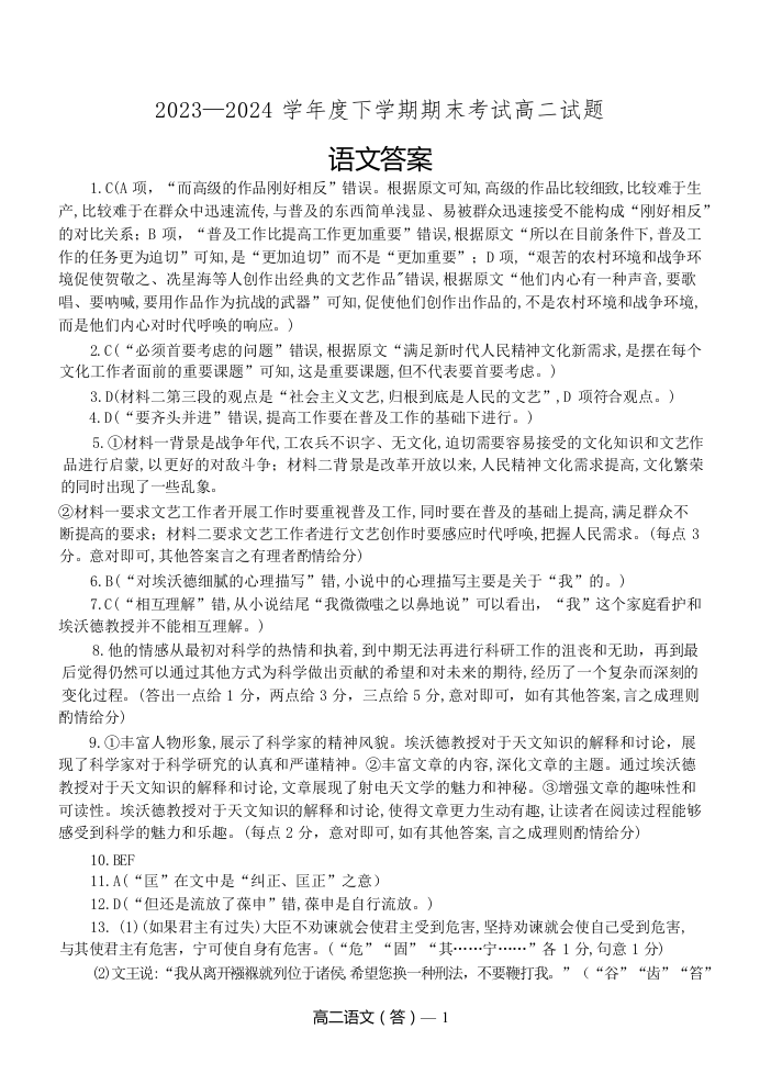 辽宁省协作体2023-2024学年高二下学期7月期末考试 语文答案