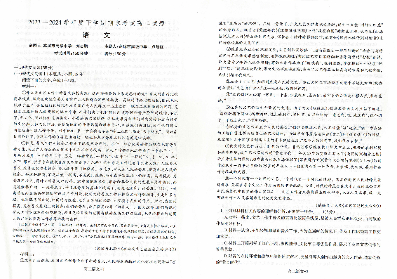 辽宁省协作体2023-2024学年高二下学期7月期末考试 语文