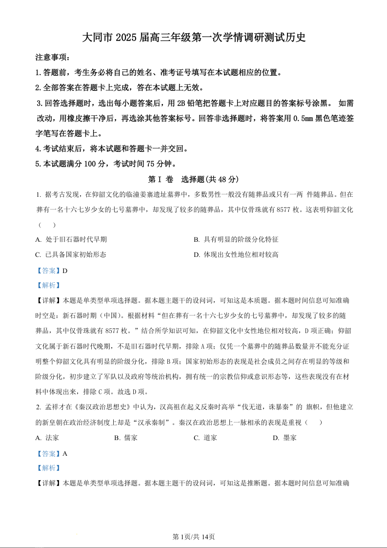 山西省大同市2025届高三年级第一次学情调研测试暨高二下学期期末考试 历史答案