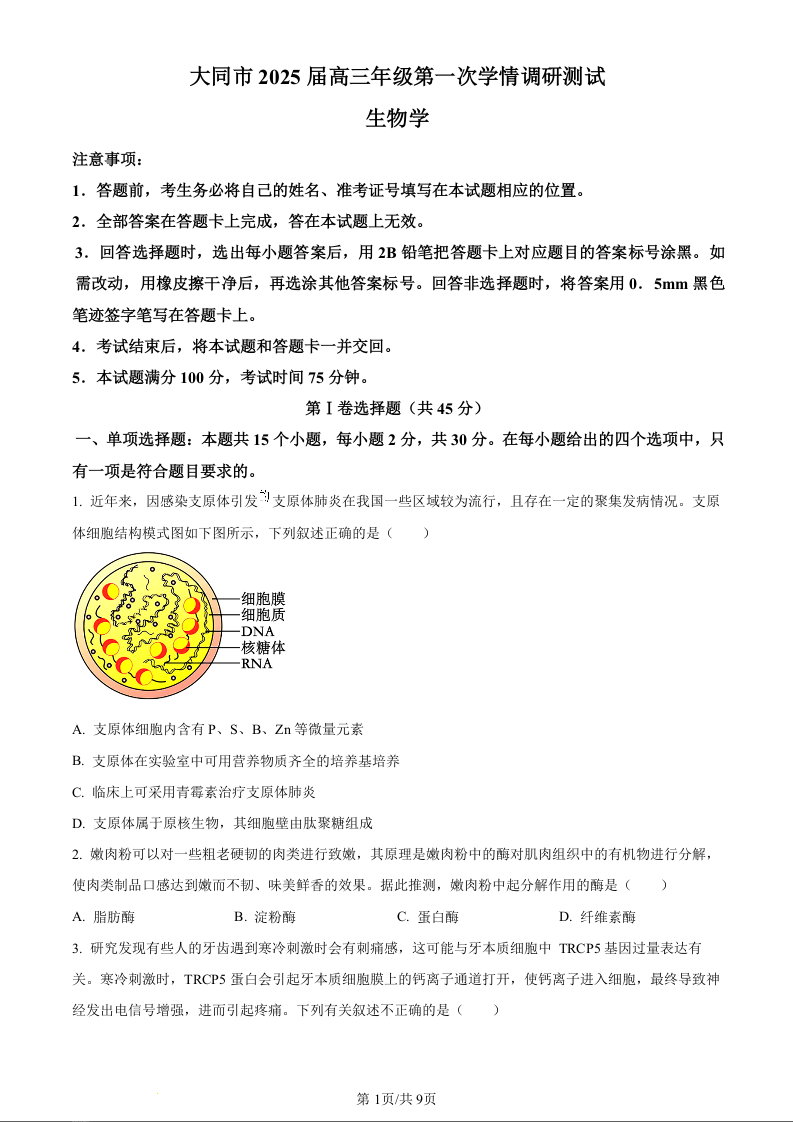 山西省大同市2025届高三年级第一次学情调研测试暨高二下学期期末考试 生物