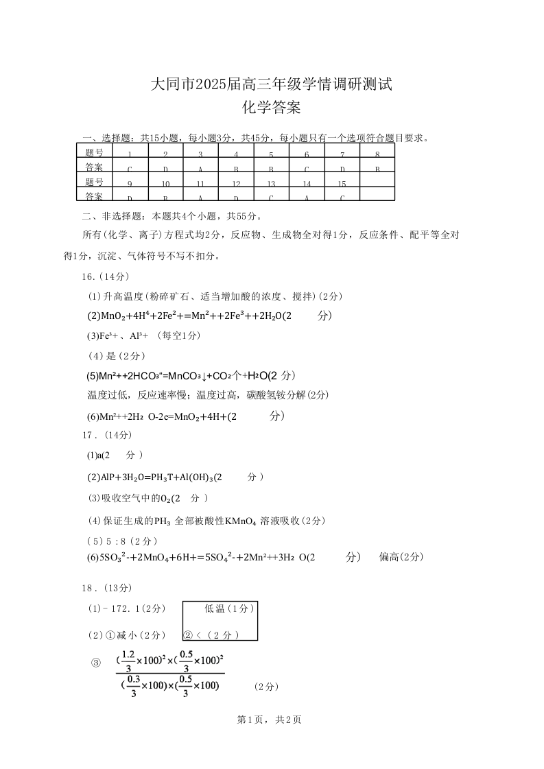 山西省大同市2025届高三年级第一次学情调研测试暨高二下学期期末考试 化学答案