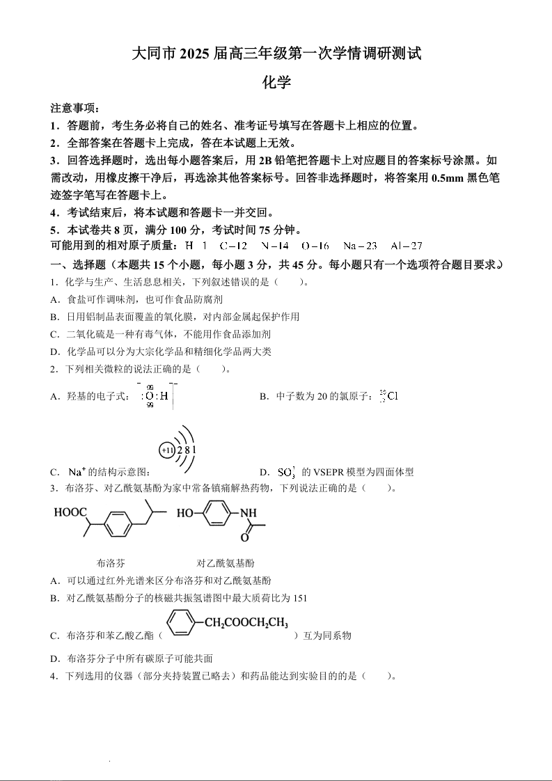 山西省大同市2025届高三年级第一次学情调研测试暨高二下学期期末考试 化学