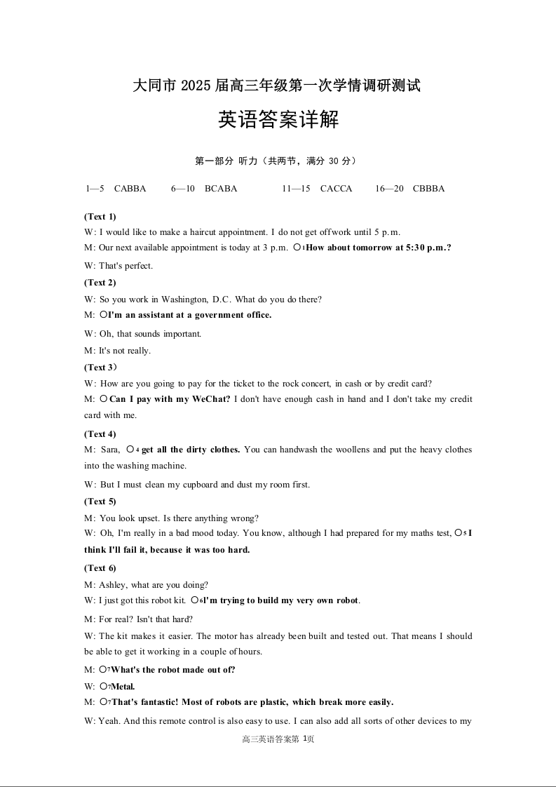 山西省大同市2025届高三年级第一次学情调研测试暨高二下学期期末考试 英语答案