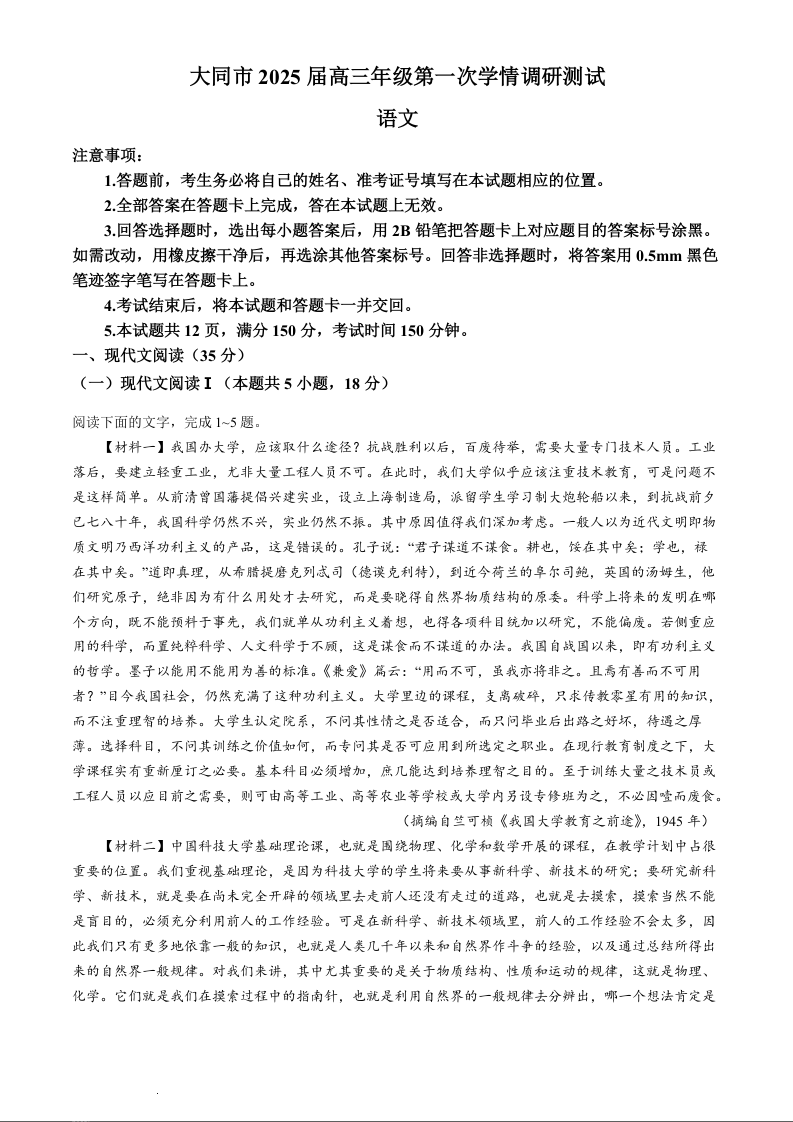 山西省大同市2025届高三年级第一次学情调研测试暨高二下学期期末考试 语文
