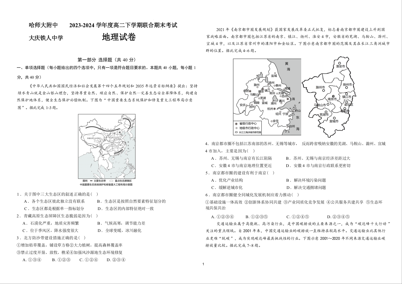 哈师大附中、大庆铁人中学2023-2024学年高二下学期期末联考 地理