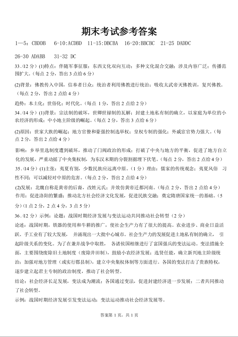 哈师大附中、大庆铁人中学2023-2024学年高二下学期期末联考 历史答案