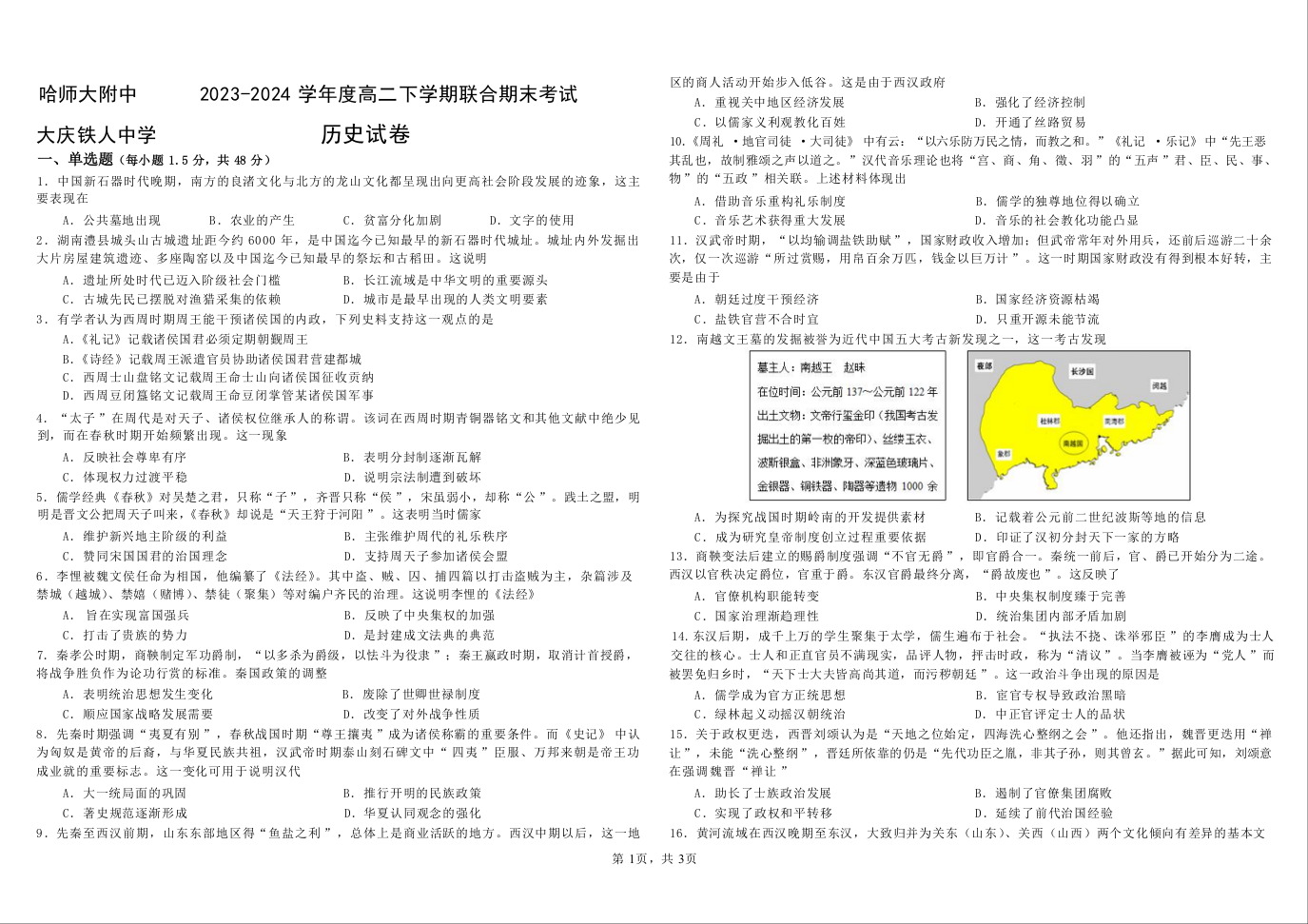哈师大附中、大庆铁人中学2023-2024学年高二下学期期末联考 历史