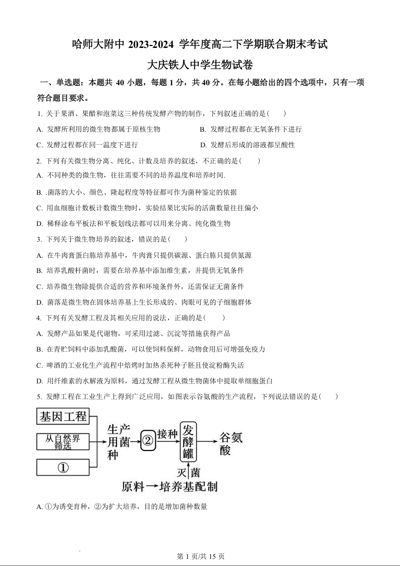 哈师大附中、大庆铁人中学2023-2024学年高二下学期期末联考 生物