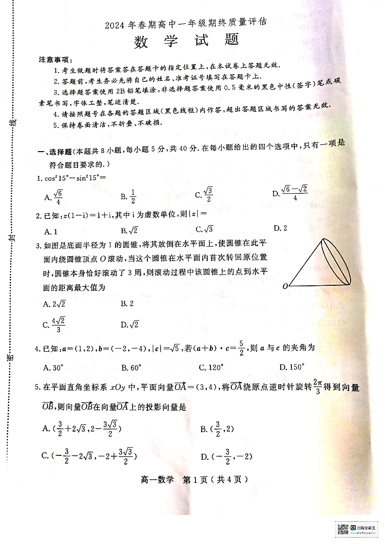 河南省南阳市2023-2024学年高一下学期期终质量评估 数学