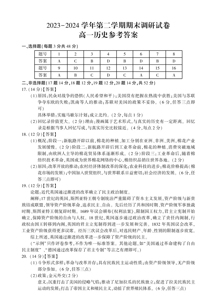 河南省开封市2023-2024学年高一下学期期末调研考试 历史答案