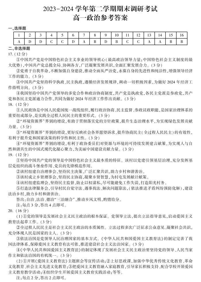 河南省开封市2023-2024学年高一下学期期末调研考试 政治答案