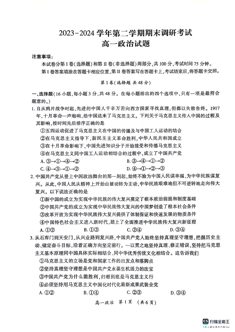 河南省开封市2023-2024学年高一下学期期末调研考试 政治