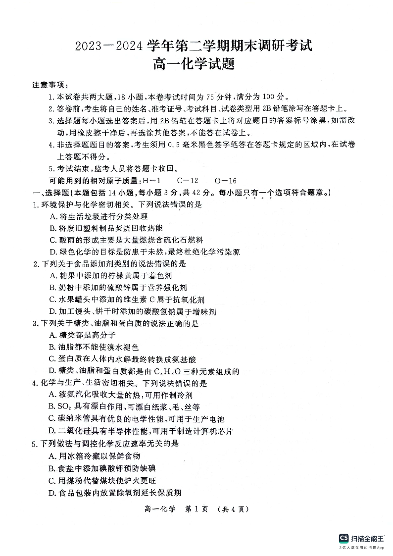 河南省开封市2023-2024学年高一下学期期末调研考试 化学