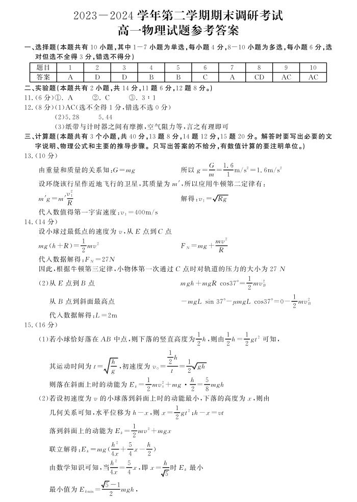河南省开封市2023-2024学年高一下学期期末调研考试 物理答案