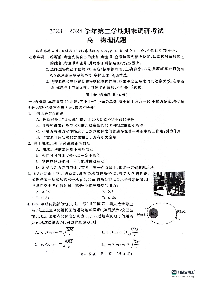 河南省开封市2023-2024学年高一下学期期末调研考试 物理