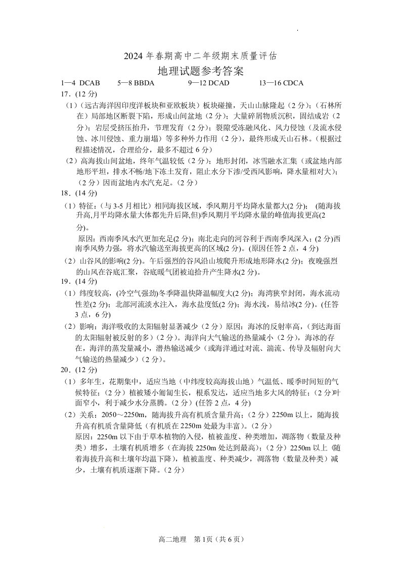 河南省南阳市2023-2024学年高二下学期期终质量评估 地理答案