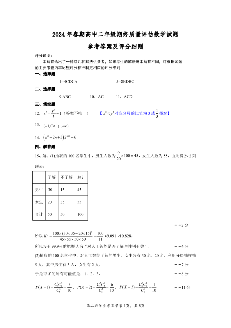 河南省南阳市2023-2024学年高二下学期期终质量评估 数学答案