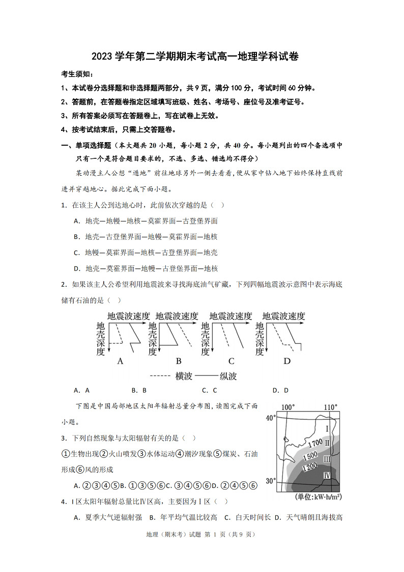 宁波慈溪市2023-2024学年高一第二学期期末测试 地理