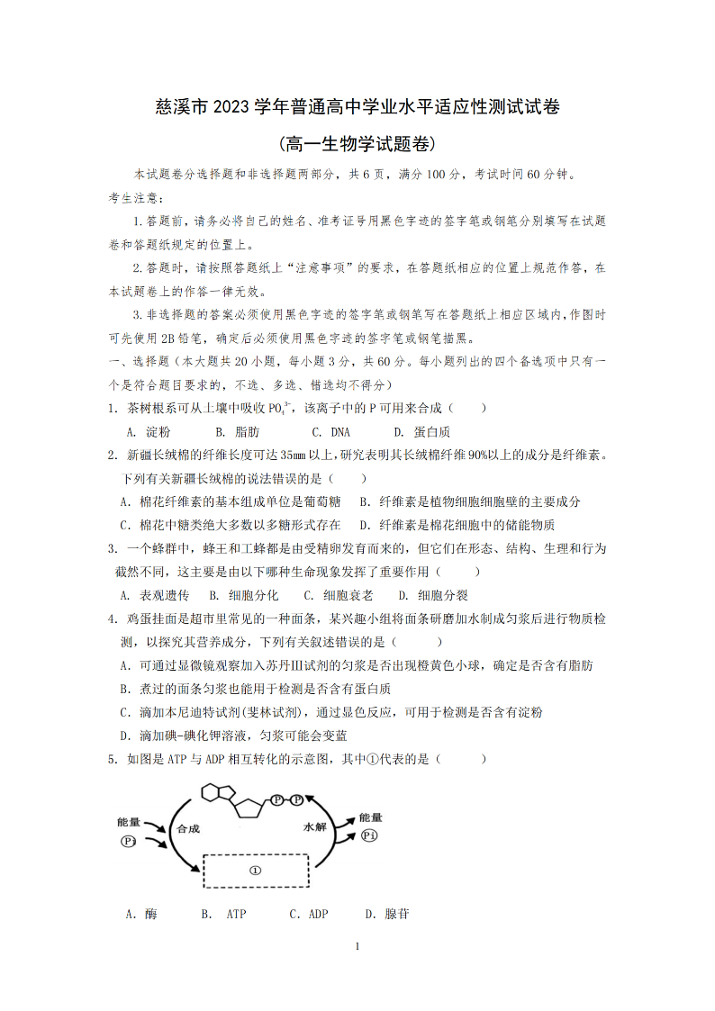 宁波慈溪市2023-2024学年高一第二学期期末测试 生物