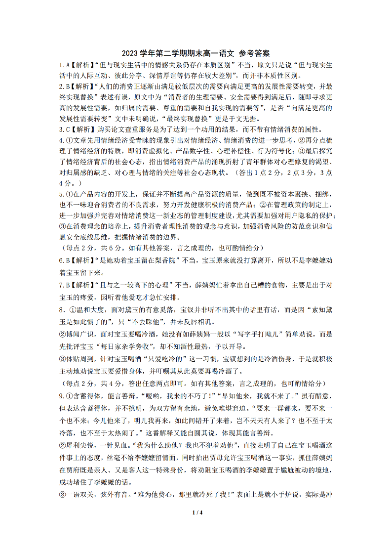 宁波慈溪市2023-2024学年高一第二学期期末测试 语文答案
