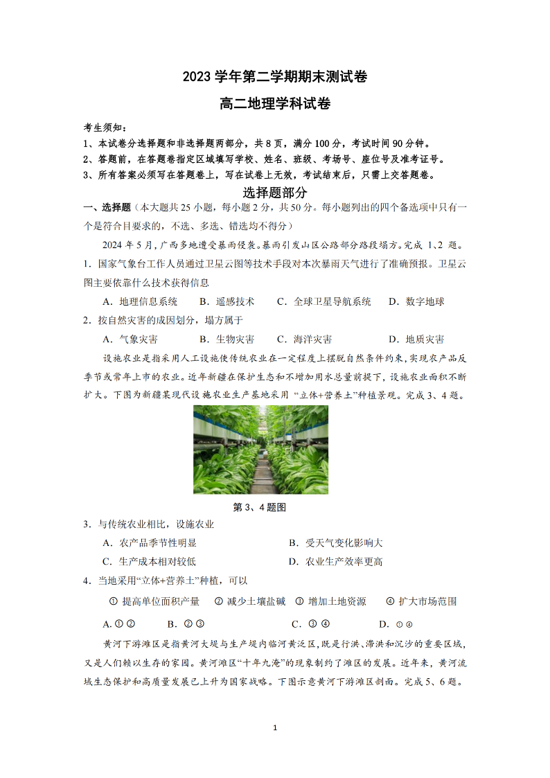 宁波慈溪市2023-2024学年高二第二学期期末测试 地理