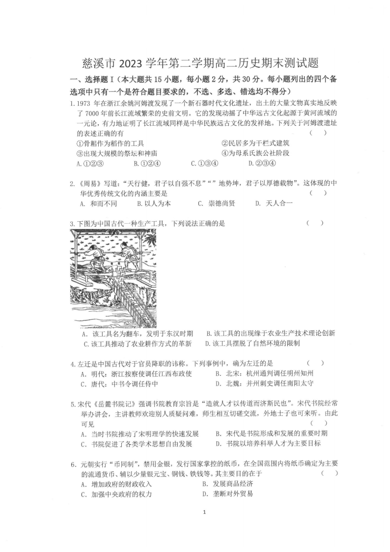 宁波慈溪市2023-2024学年高二第二学期期末测试 历史