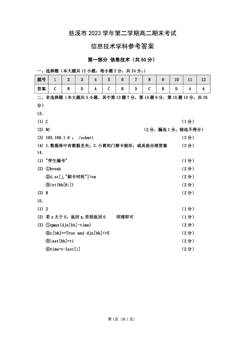 宁波慈溪市2023-2024学年高二第二学期期末测试 技术答案