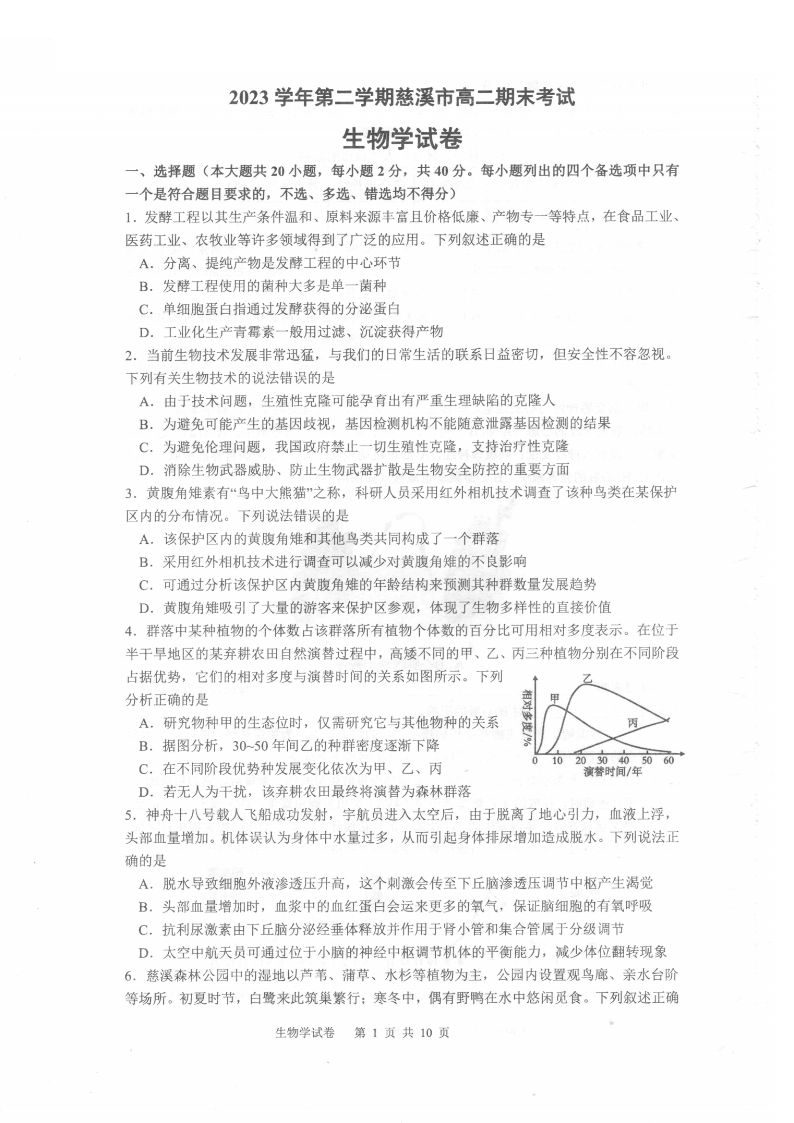 宁波慈溪市2023-2024学年高二第二学期期末测试 生物