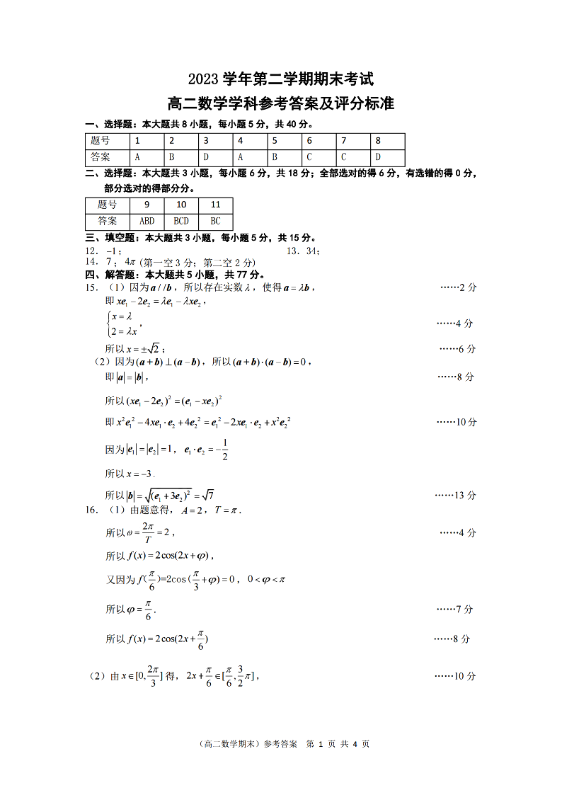 宁波慈溪市2023-2024学年高二第二学期期末测试 数学答案