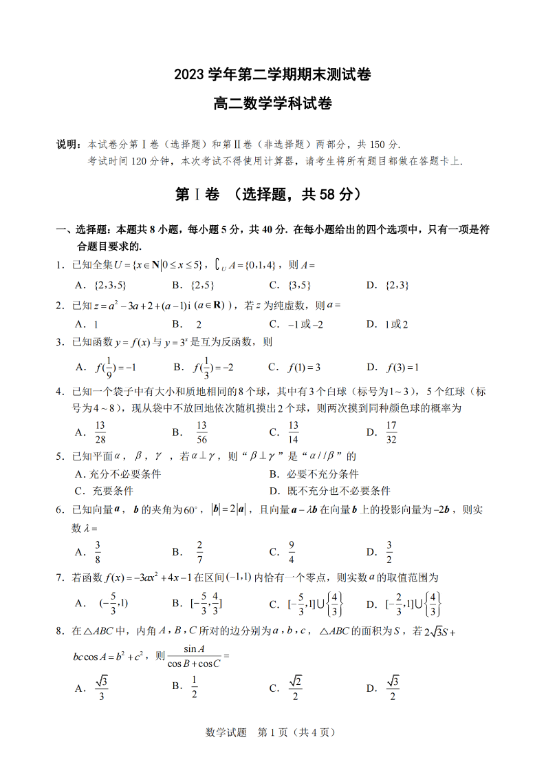 宁波慈溪市2023-2024学年高二第二学期期末测试 数学