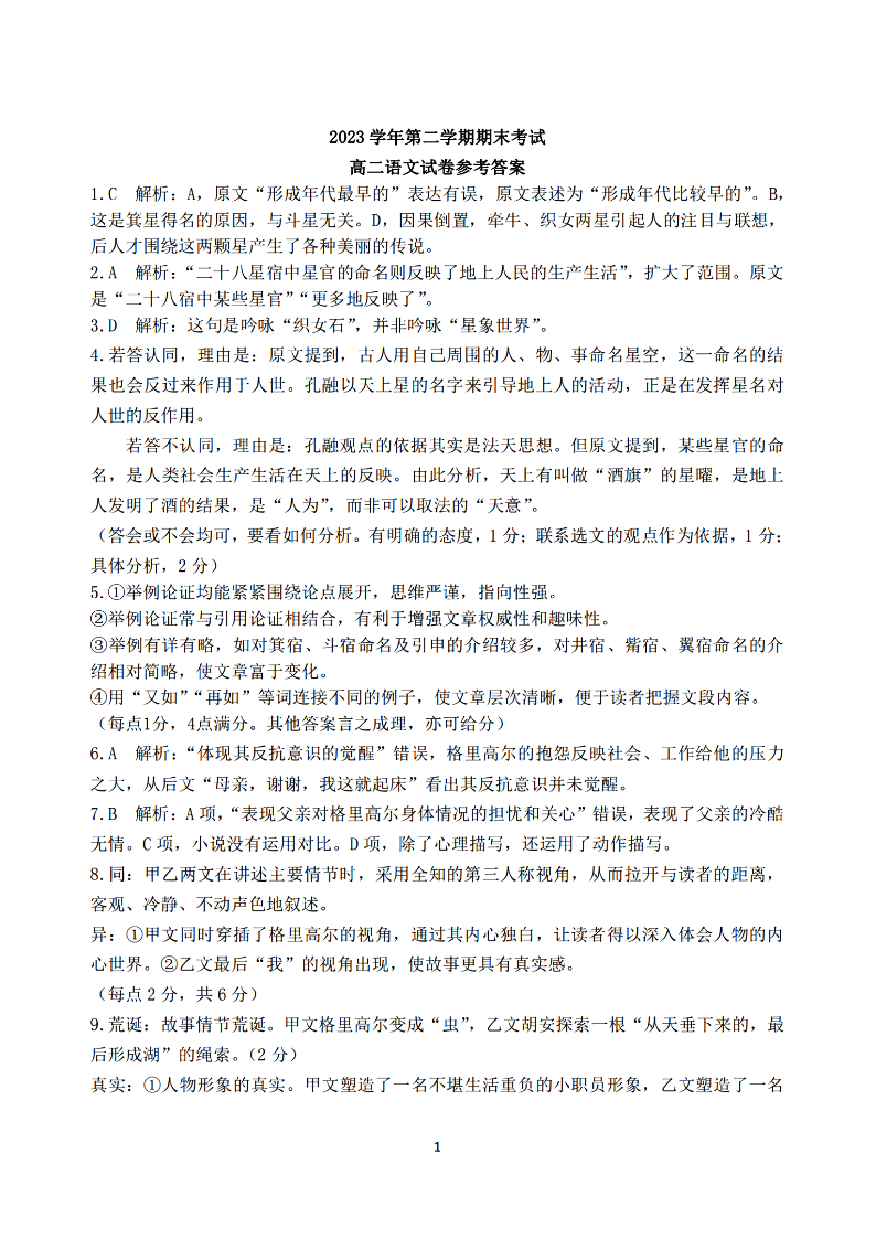 宁波慈溪市2023-2024学年高二第二学期期末测试 语文答案