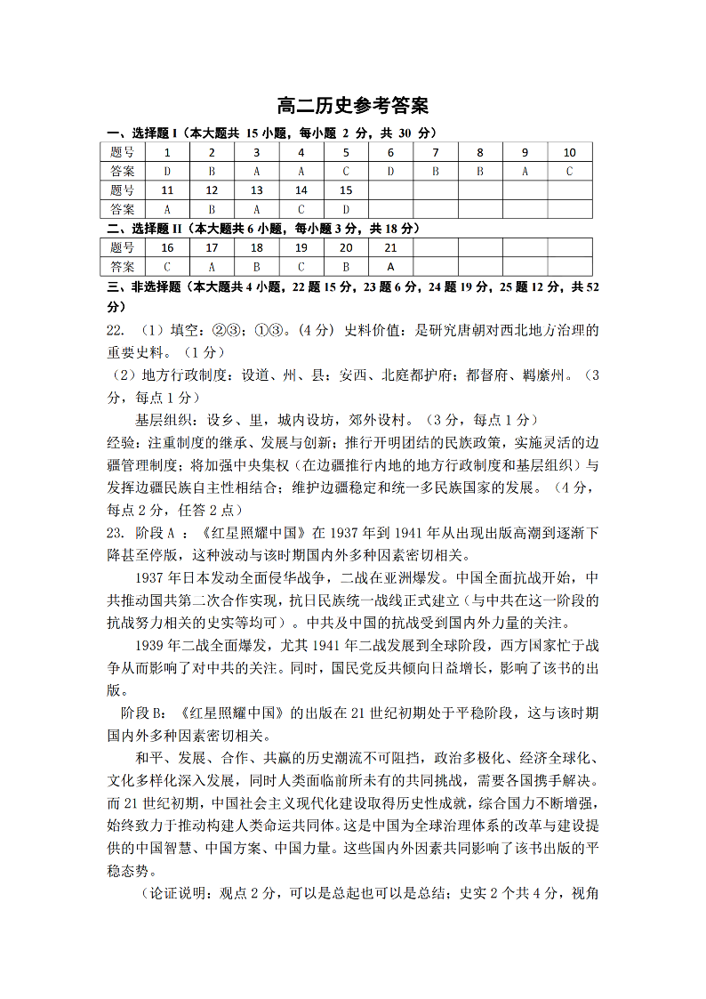 舟山市2023-2024学年高二第二学期期末检测 历史答案