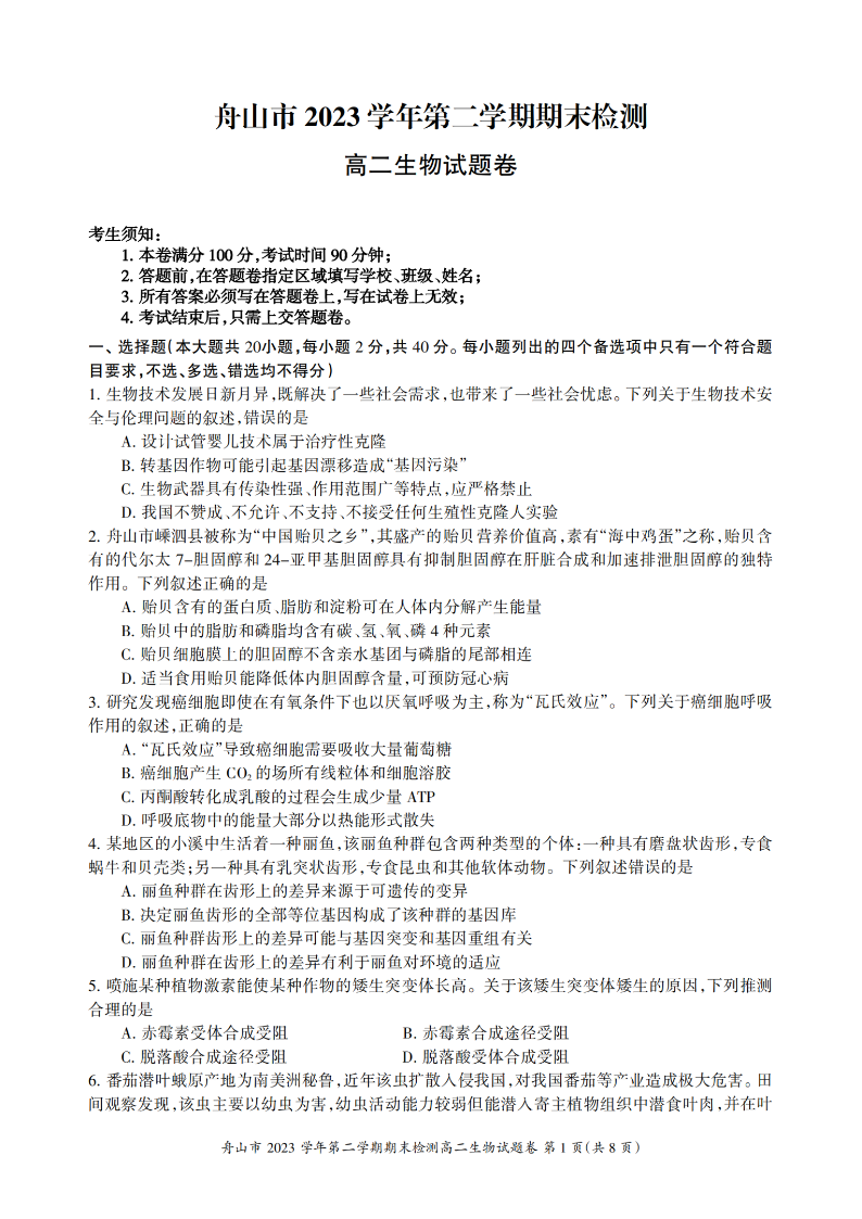 舟山市2023-2024学年高二第二学期期末检测 生物