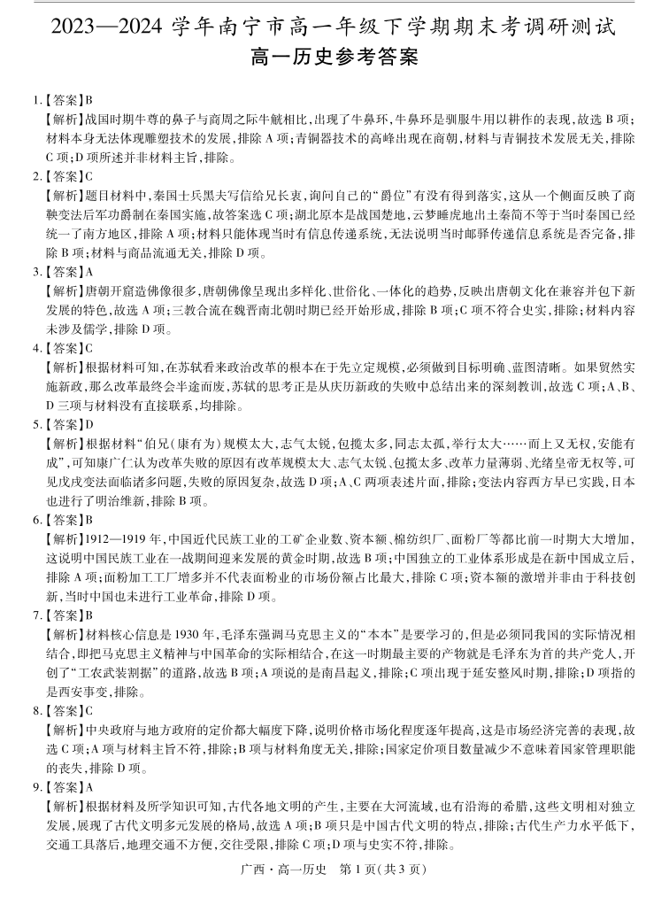 广西壮族自治区2023-2024学年南宁市高一年级下学期期末考试调研测试 历史答案