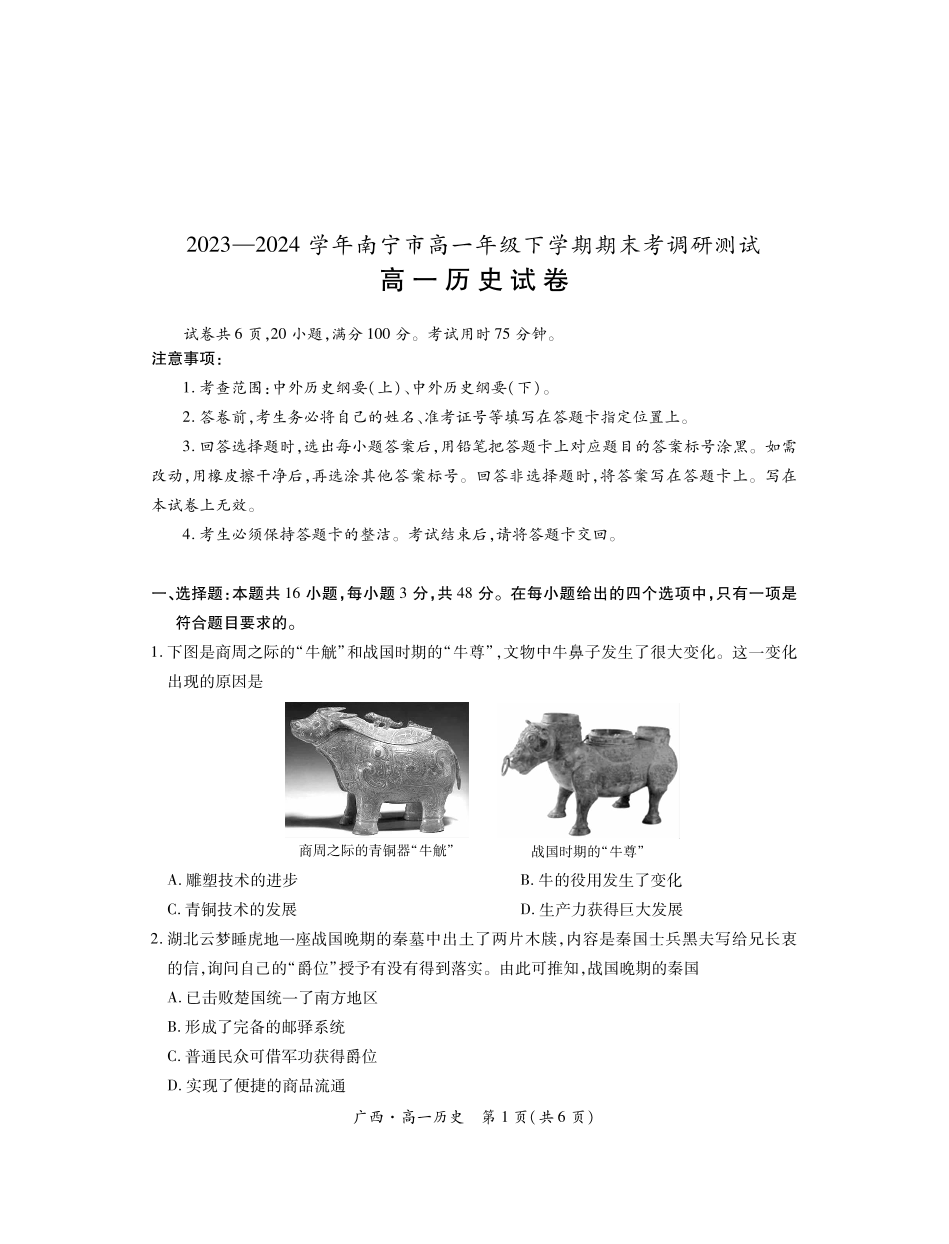 广西壮族自治区2023-2024学年南宁市高一年级下学期期末考试调研测试 历史