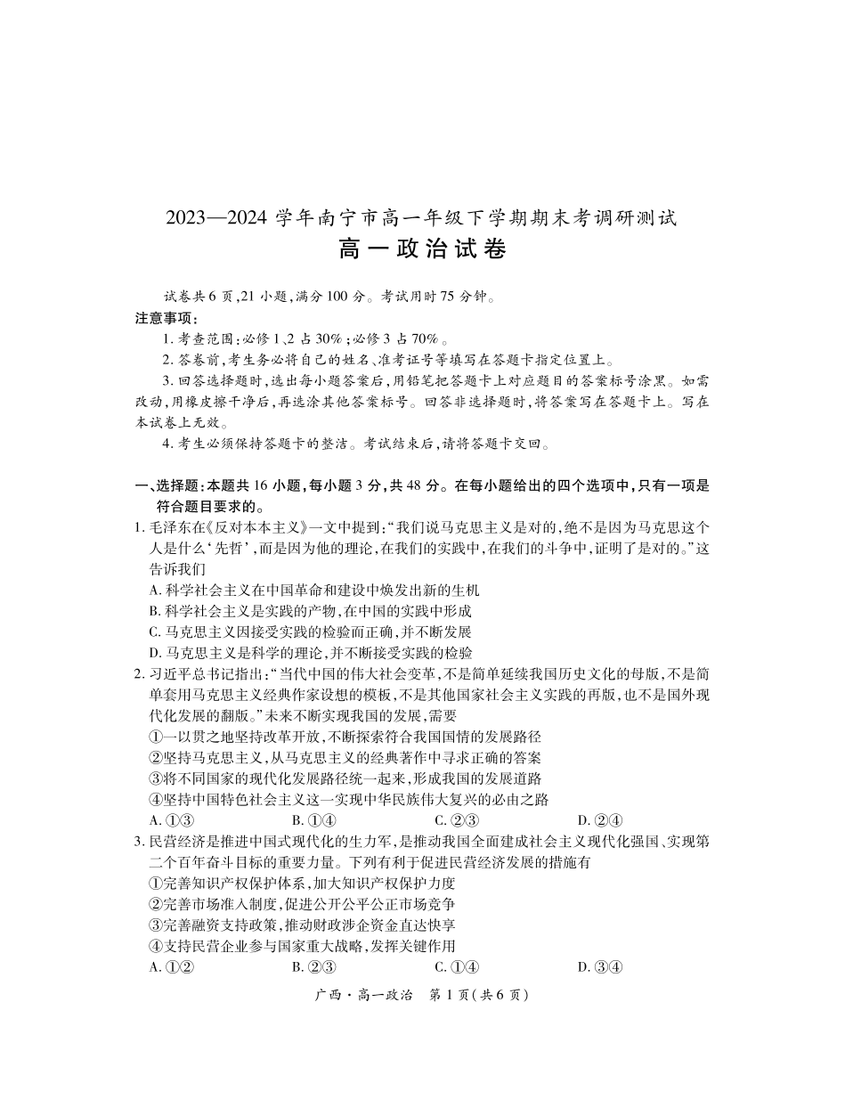 广西壮族自治区2023-2024学年南宁市高一年级下学期期末考试调研测试 政治
